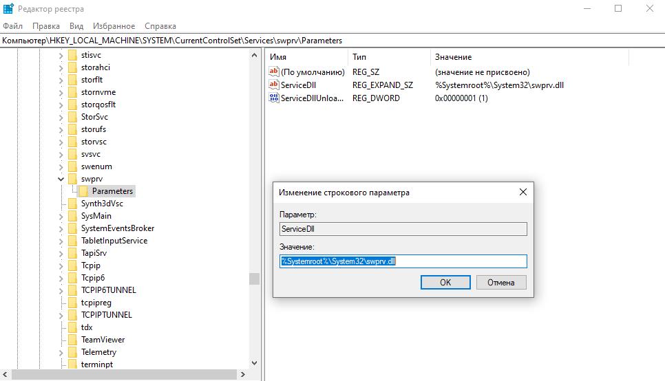 В подразделе Parameters создаем Расширяемый строковый параметр с именем ServiceDll и значением %Systemroot%\System32\swprv.dll